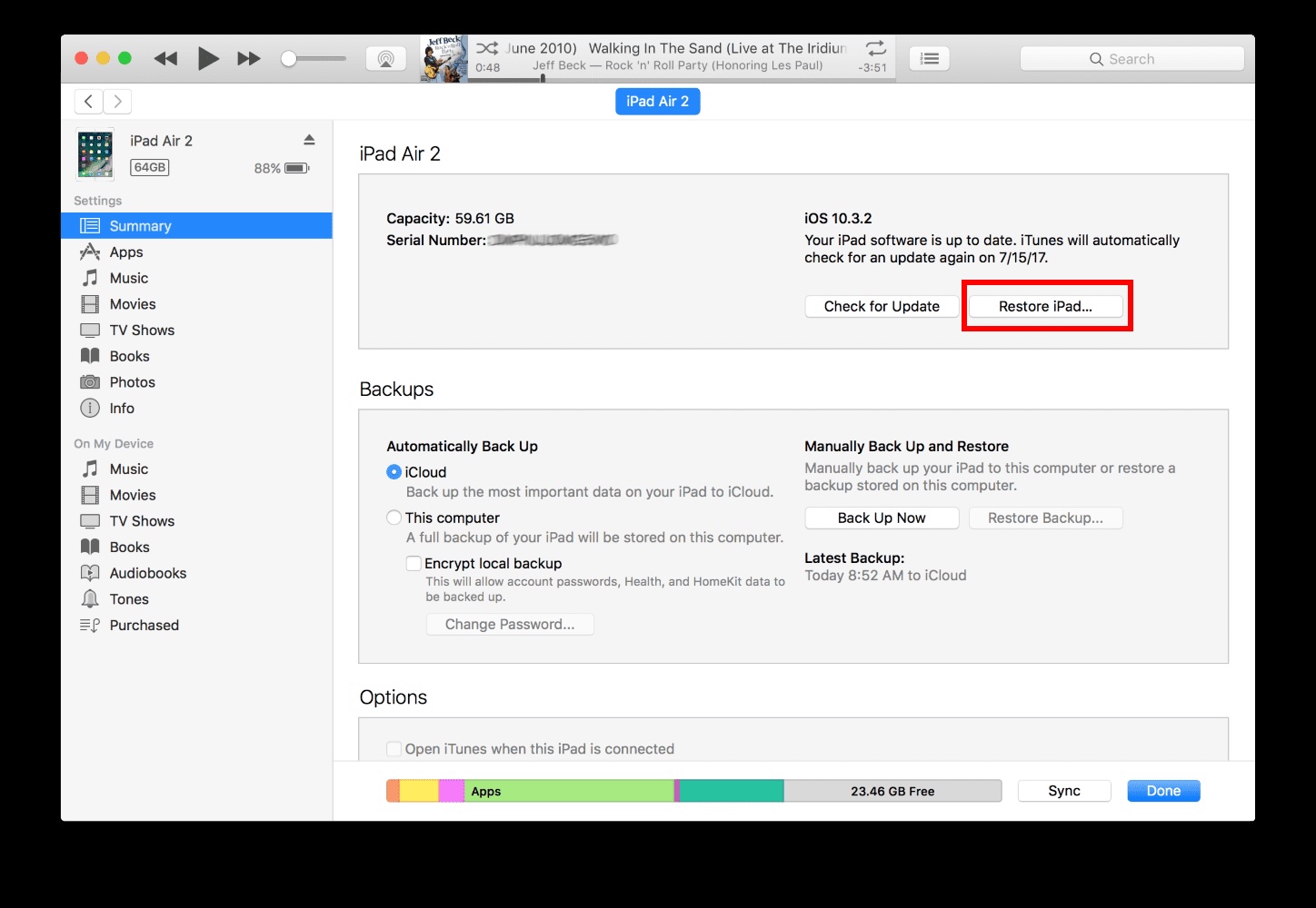 - 2.iTunes 若能識別 iPad,會顯示設備資訊並自動檢測是否有系統問題。