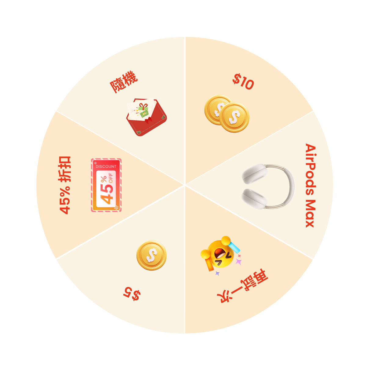 4. 在活動期間,每位使用者每天有兩 (2) 次轉動轉盤的機會。獎品如 $5、$10 和 45% OFF 優惠券,即使訂單中包含多個產品,也不能在同一個訂單中疊加或合併使用。